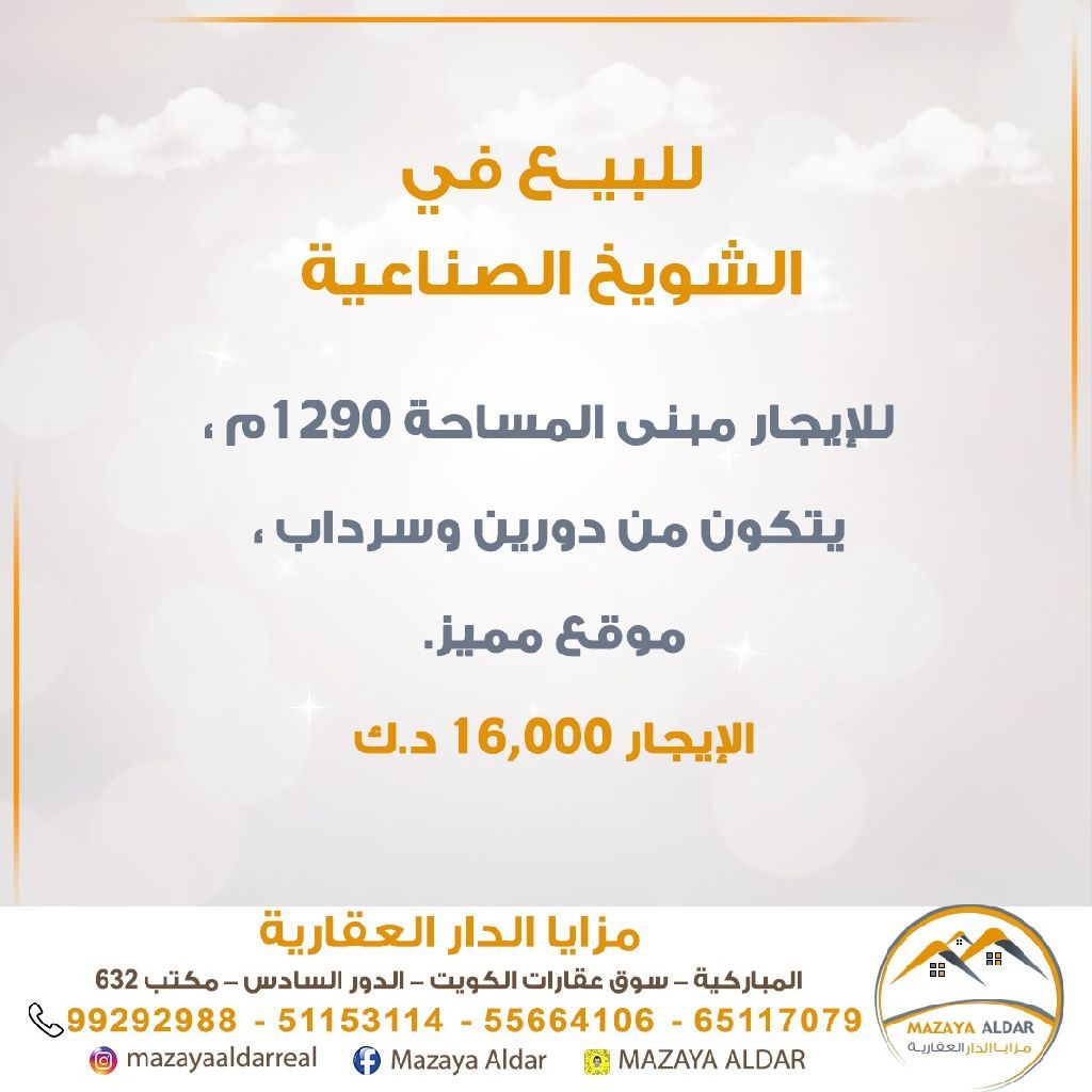 For rent A building in the Shuwaikh Industrial Area with an area of 1290 SQM, consisting of two floors and a basement, in a prime location. For serious inquiries only, no brokers allowed. rent is 16000 dinars. For inquiries, contact via