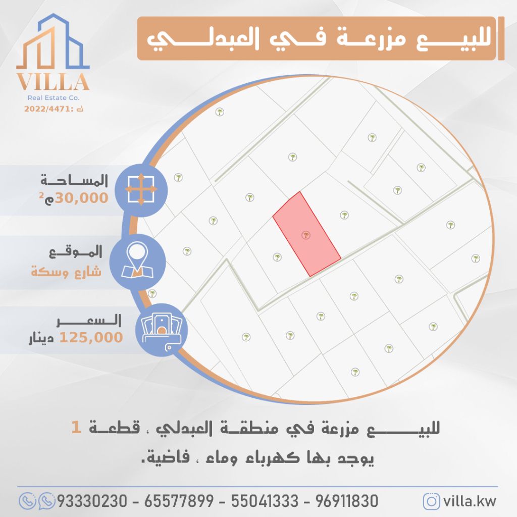 للبيع: مزرعة في منطقة العبدلي، قطعة 1، المساحة 30000 متر مربع، الموقع على شارع وسكة، يوجد بها كهرباء وماء، فاضية. السعر: 125000 دينار كويتي. للاستفسار، اتصل على: 1، 2، 3، 4.
