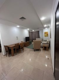 Furnished apartment for rent in Salmiya Block 2, prime location, excellent finishing, consisting of a living room, kitchen, 3 bedrooms including a master bedroom, 2 bathrooms, laundry room, CCTV cameras, security, internet, gym, lobby, billiards room, parking, water, maintenance, and electricity included. rent KD575 + insurance + company commission