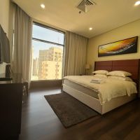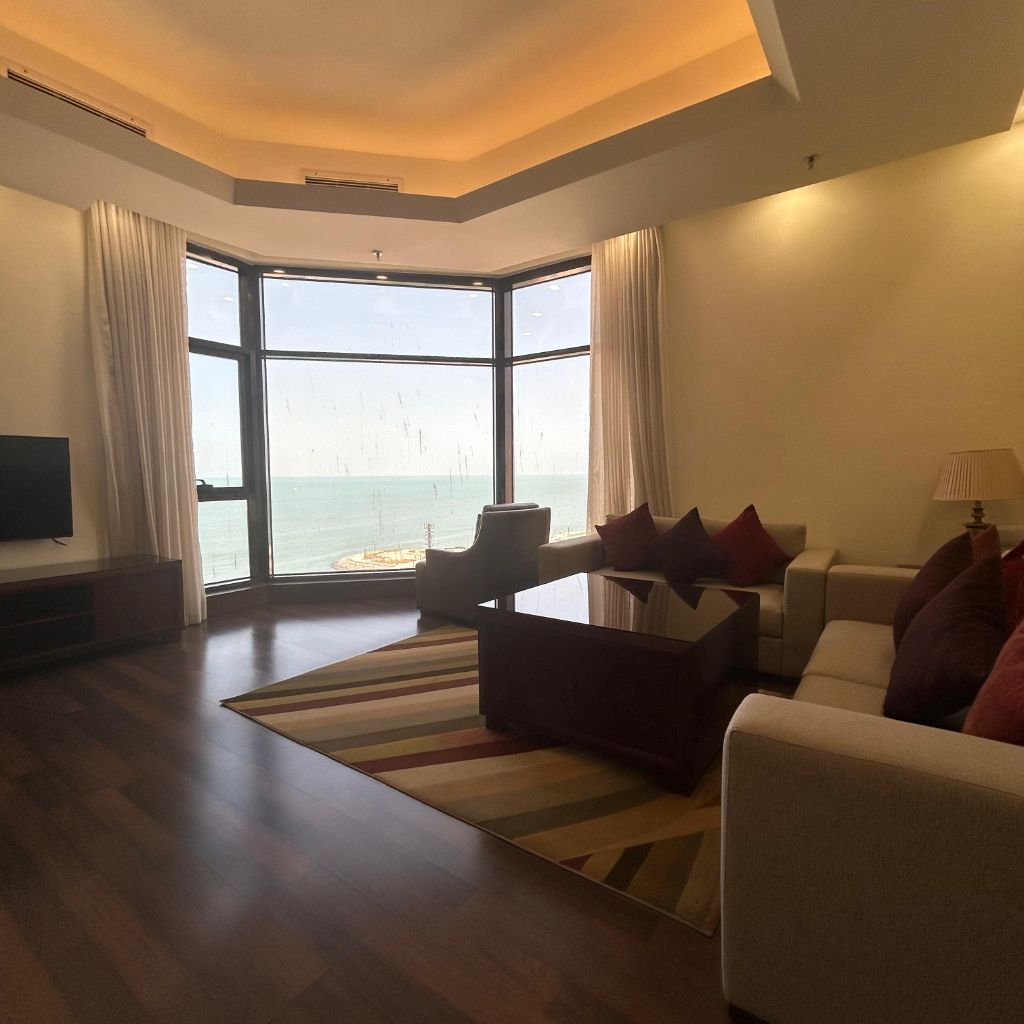 Furnished apartment for rent in Bneid Al Qar, Block 1. Prime location, sea view, living room, kitchen, bedroom, bathroom, surveillance cameras, security, internet, gym, swimming pool, lobby, elevator, private parking, and cleaning service. rent starts at KD575 + security deposit + company commission
