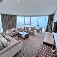 A furnished apartment with a sea view for rent in Salmiya, Block 7, featuring a prime location on the Arabian Gulf Street with a direct first - row sea view. It consists of a master bedroom, a living room, a kitchen, 2 bathrooms, a reception lobby, a swimming pool, a gym, a parking space, internet, an internal intercom, cleaning service, and includes electricity, water, and maintenance. rent starts from