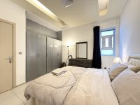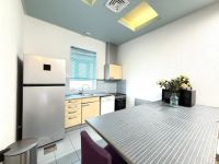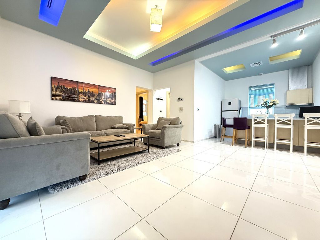 A furnished apartment in the Salibiya area, Kuwait, containing two bedrooms, one bathroom, a living room with an open kitchen, and one shaded parking space. A shared outdoor area with a swimming pool and a gym is available. It is available for rent to foreign residents at a price of 550 Kuwaiti dinars per month. A security deposit equivalent to one month's rent and an agency fee equivalent to half a month's rent apply. The map location is for guidance purposes.