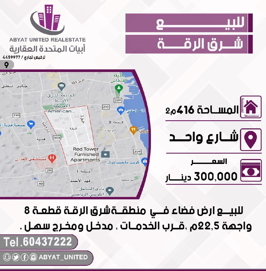 للبيع: أرض فضاء في منطقة شرق الرقة، قطعة 8. الموقع: شارع واحد، المساحة: 416 م²، الواجهة: 22.5 م، قرب الخدمات، مدخل ومخرج سهل. للاستفسار، النقال: 1، السعر: 300,000 دينار، الكود: 9.
