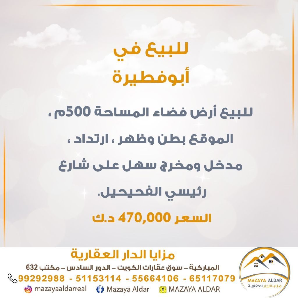للبيع: أرض فضاء في ضاحية أبو فطيرة، المساحة 500 متر مربع. الموقع بطن وظهر، مع ارتداد، ومدخل ومخرج سهل على شارع رئيسي في الفحيحيل. للجادين فقط، يمنع الوسطاء. السعر: 470,000 دينار كويتي. للاستفسار، الاتصال عبر الهاتف المحمول.