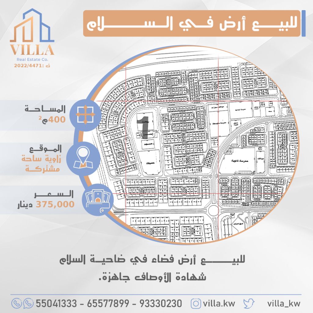 للبيع أرض فضاء في ضاحية السلام، المساحة 400م، الموقع زاوية ساحة مشتركة، شهادة الأوصاف جاهزة. السعر 375 ألف دينار كويتي، ترخيص 2022/4471. للاستفسار، نقال 1، نقال 2، نقال 3.