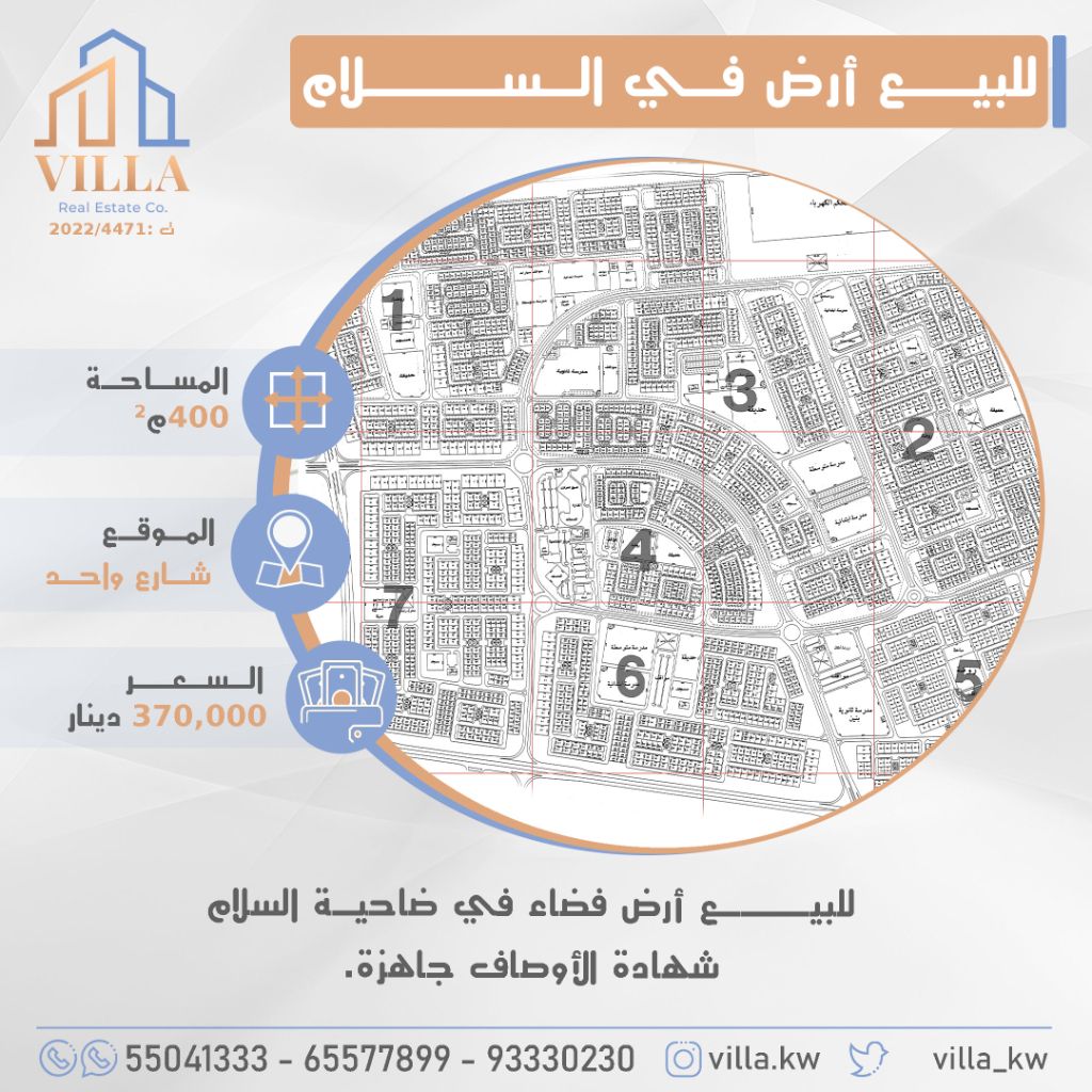 للبيع أرض فضاء في ضاحية السلام، المساحة 400م، الموقع شارع واحد، شهادة الأوصاف جاهزة. السعر 370000 دينار كويتي للاستفسار نقال 1 نقال 2 نقال 3