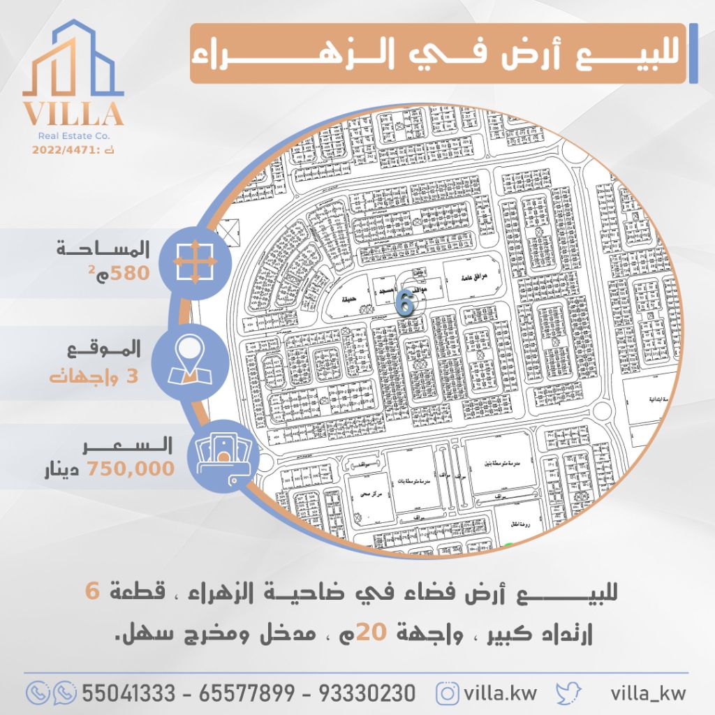 للبيع: أرض فضاء في ضاحية الزهراء، قطعة 6. المساحة: 580 متر مربع. الموقع: 3 واجهات، ارتداد كبير، واجهة 20 متر، مدخل ومخرج سهل. السعر: 750,000 دينار كويتي. للاستفسار، اتصل على نقال 1، نقال 2، نقال 3.