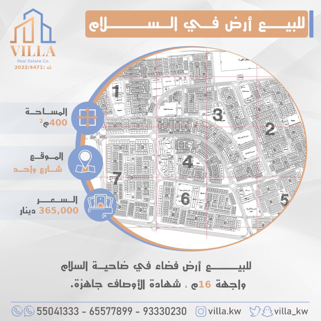 للبيع أرض فضاء في ضاحية السلام، المساحة 400م²، الموقع شارع واحد، واجهة 16م، شهادة الأوصاف جاهزة. السعر 365 ألف دينار كويتي. للاستفسار، نقال 1، نقال 2، نقال 3.