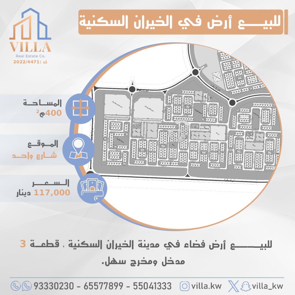 للبيع أرض فضاء في مدينة الخيران السكنية، قطعة 3، المساحة 400 متر مربع، الموقع شارع واحد، مدخل ومخرج سهل. السعر 117,000 دينار كويتي. للاستفسار، نقال 1، نقال 2، نقال 3.