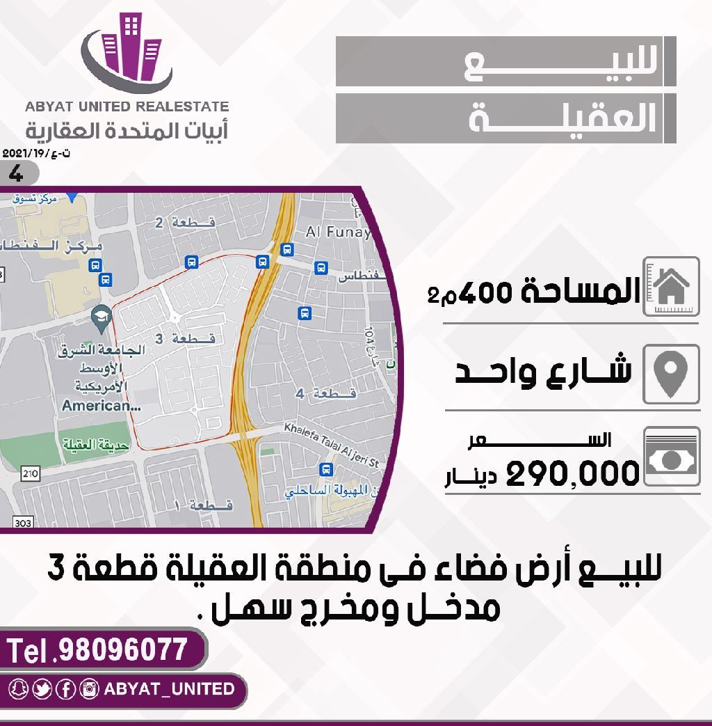 للبيع أرض فضاء في منطقة العقيلة، قطعة رقم 3، الموقع على شارع واحد. المساحة: 400 متر مربع، مدخل ومخرج سهل. للاستفسار، النقال رقم 1. السعر: 290 ألف دينار. الكود: 4.