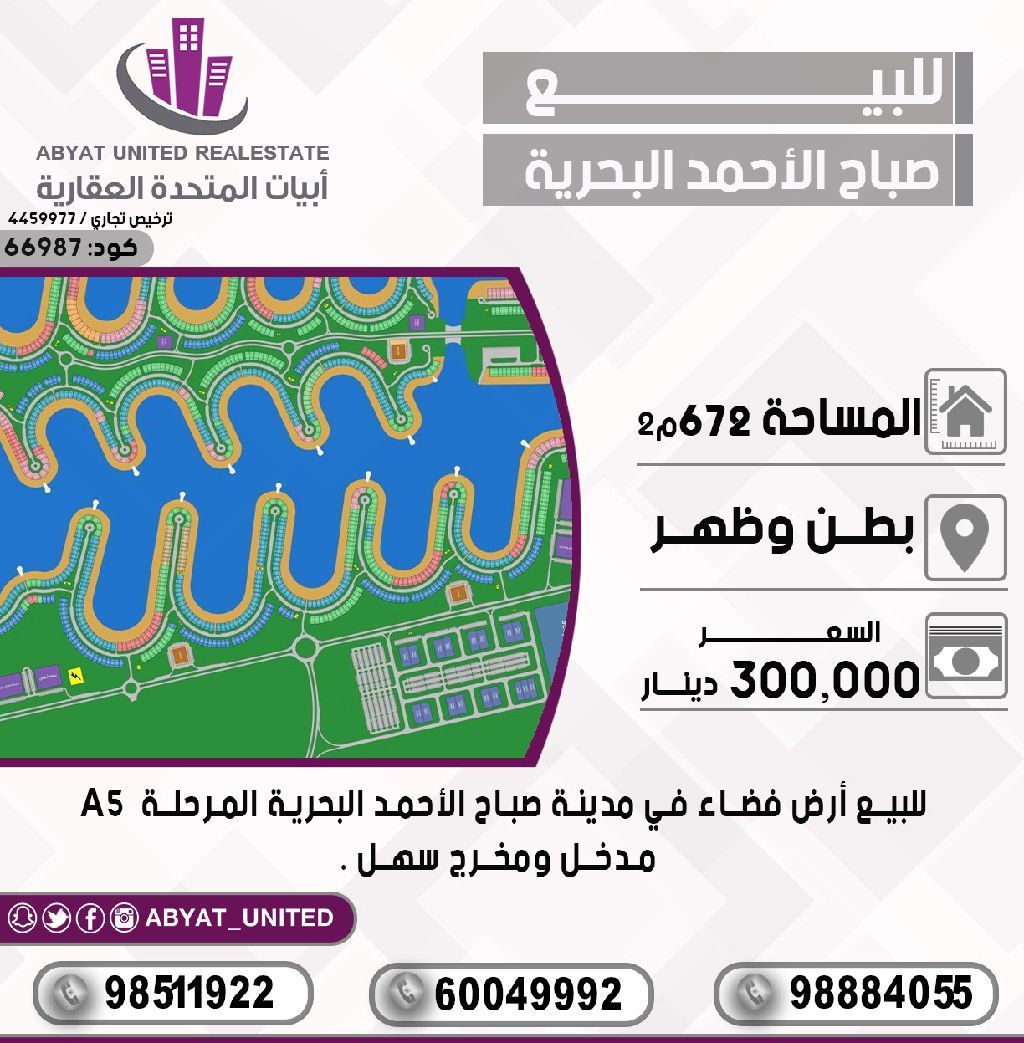 للبيع: أرض فضاء في مدينة صباح الأحمد البحرية، المرحلة A5، الموقع: بطن وظهر، المساحة 672 متر مربع، مدخل ومخرج سهل. للاستفسار، النقال 1، النقال 2، النقال 3. السعر: 300 ألف دينار. الكود: 66987.