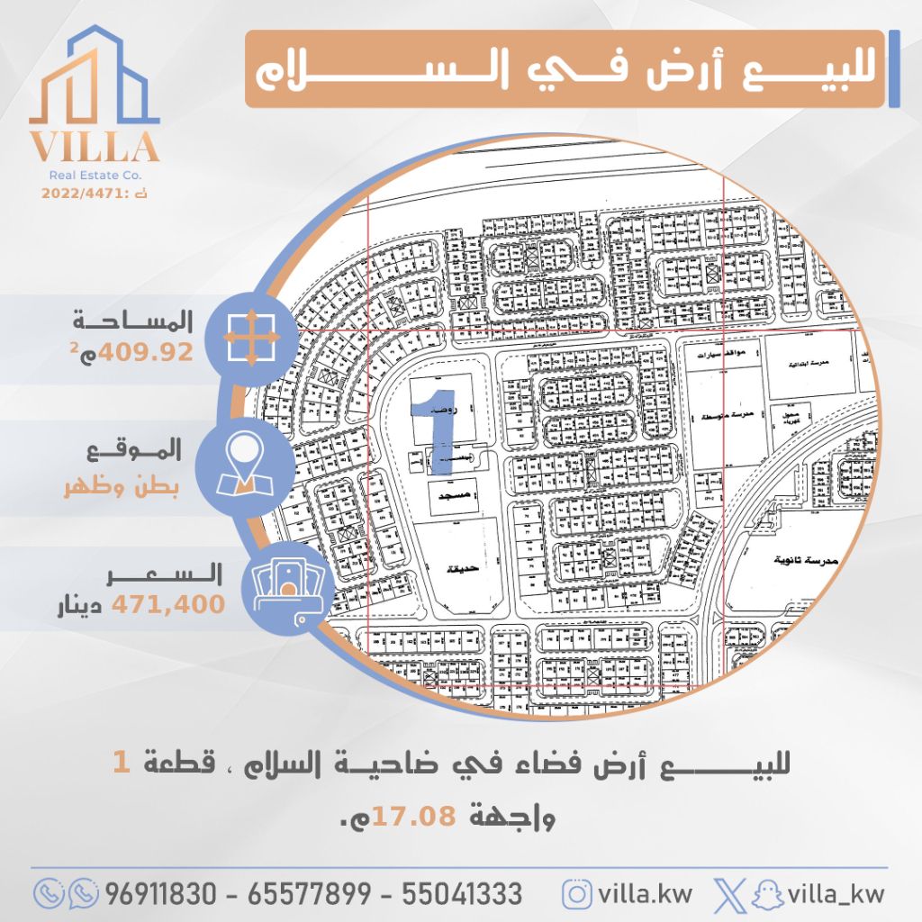 للبيع أرض فضاء في ضاحية السلام، قطعة 1، المساحة 409.92 متر مربع، الموقع بطن وظهر، واجهة 17.08 متر. السعر 471,400 دينار كويتي. للاستفسار، نقال 1، نقال 2، نقال 3.