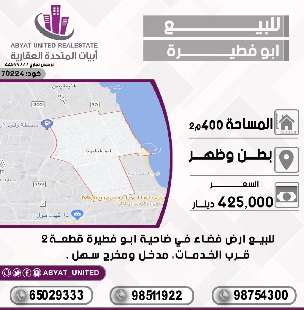 للبيع: أرض فضاء في ضاحية أبو فطيرة. الموقع: بطن وظهر. المساحة: 400 متر مربع. قرب الخدمات، مدخل ومخرج سهل. للاستفسار: النقال رقم 1، النقال رقم 2، النقال رقم 3. السعر: 425 ألف دينار. الكود: 70224.