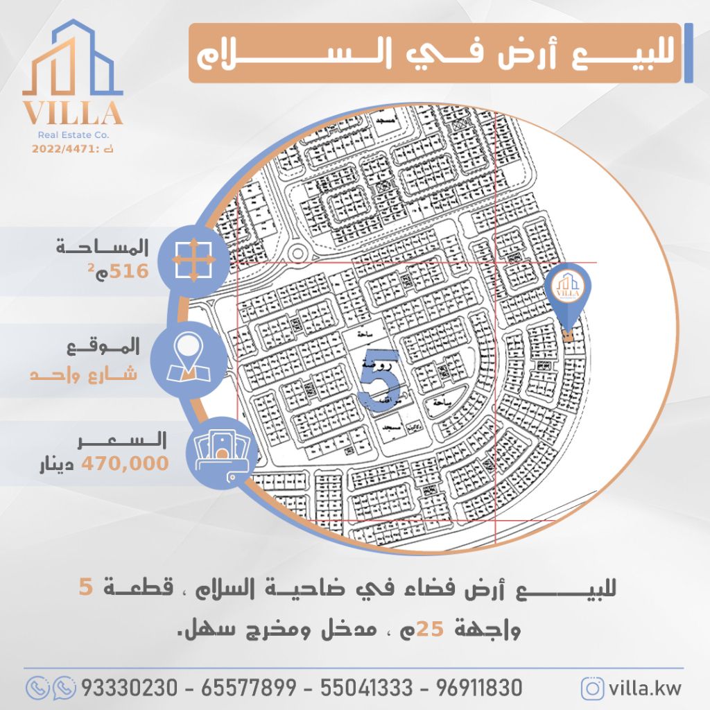 للبيع أرض فضاء في ضاحية السلام، قطعة 5، المساحة 516 متر مربع، الموقع شارع واحد، واجهة 25 متر، مدخل ومخرج سهل. السعر 470,000 دينار كويتي. للاستفسار، نقال 1، نقال 2، نقال 3، نقال 4.