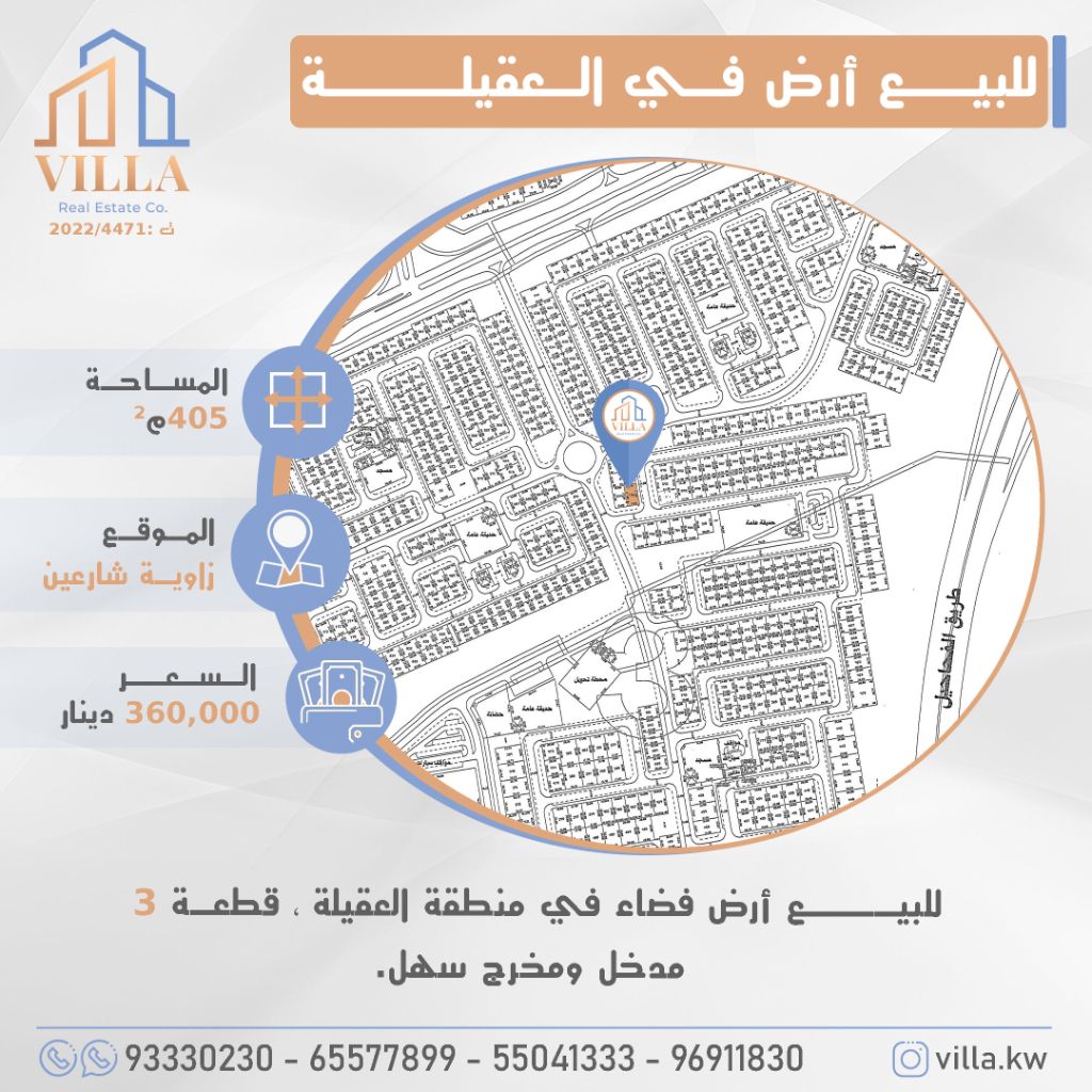 للبيع: أرض فضاء في منطقة العقيلة، قطعة 3، المساحة 405 متر مربع، الموقع زاوية شارعين، مدخل ومخرج سهل. السعر 360,000 دينار كويتي. للاستفسار، نقال 1، نقال 2، نقال 3، نقال 4.