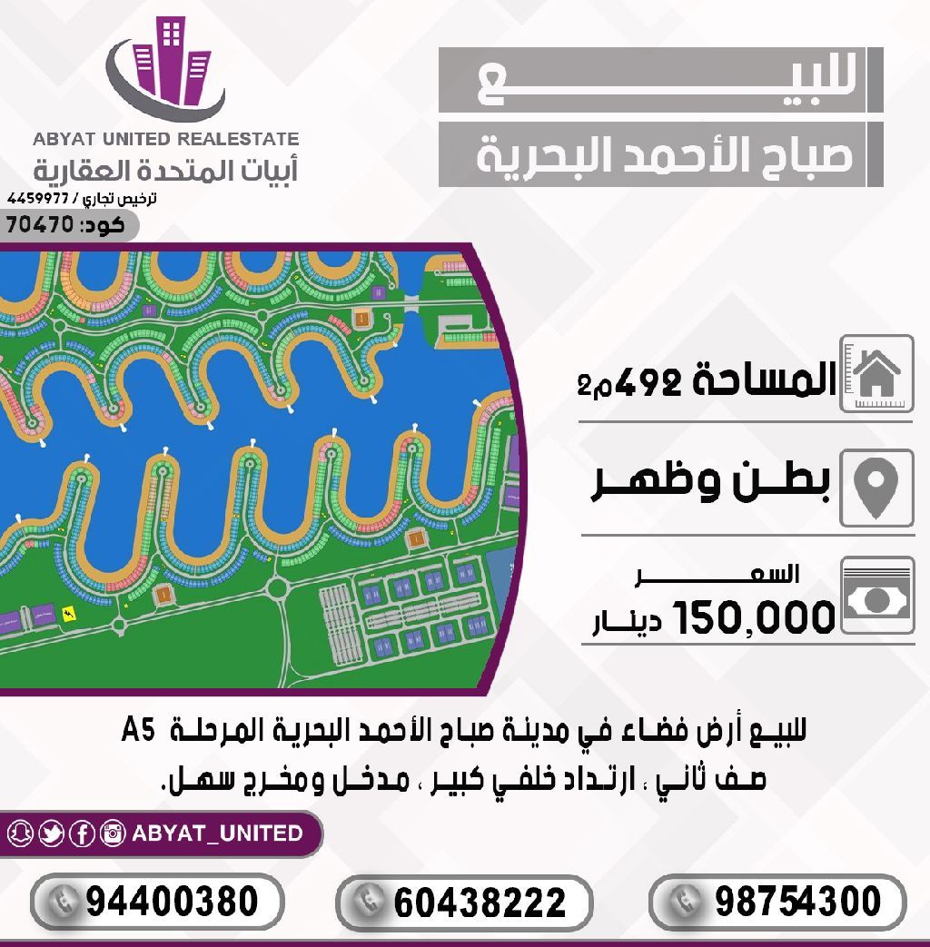 للبيع: أرض فضاء في مدينة صباح الأحمد البحرية، المرحلة A5. الموقع: بطن وظهر. المساحة: 492 متر مربع، صف ثاني. ارتداد خلفي كبير. مدخل ومخرج سهل. للاستفسار، أرقام النقال: 1، 2، 3. السعر: 150,000 دينار. الكود: 70470.