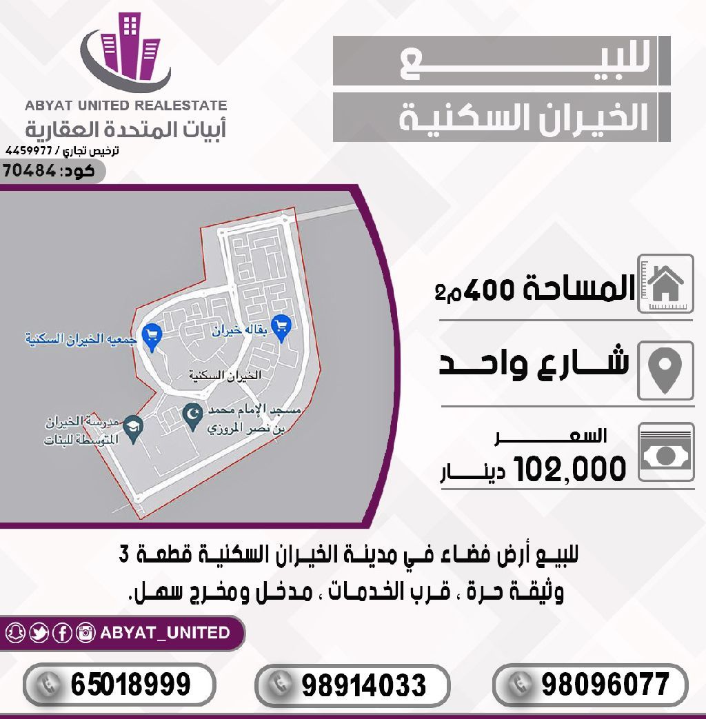 للبيع: أرض فضاء في مدينة الخيران السكنية، قطعة 3. الموقع: شارع واحد. المساحة: 400 متر مربع. وثيقة حرة. قرب الخدمات. مدخل ومخرج سهل. للاستفسار، أرقام النقال: 1، 2، 3. السعر: 102 ألف دينار. الكود: 70484.