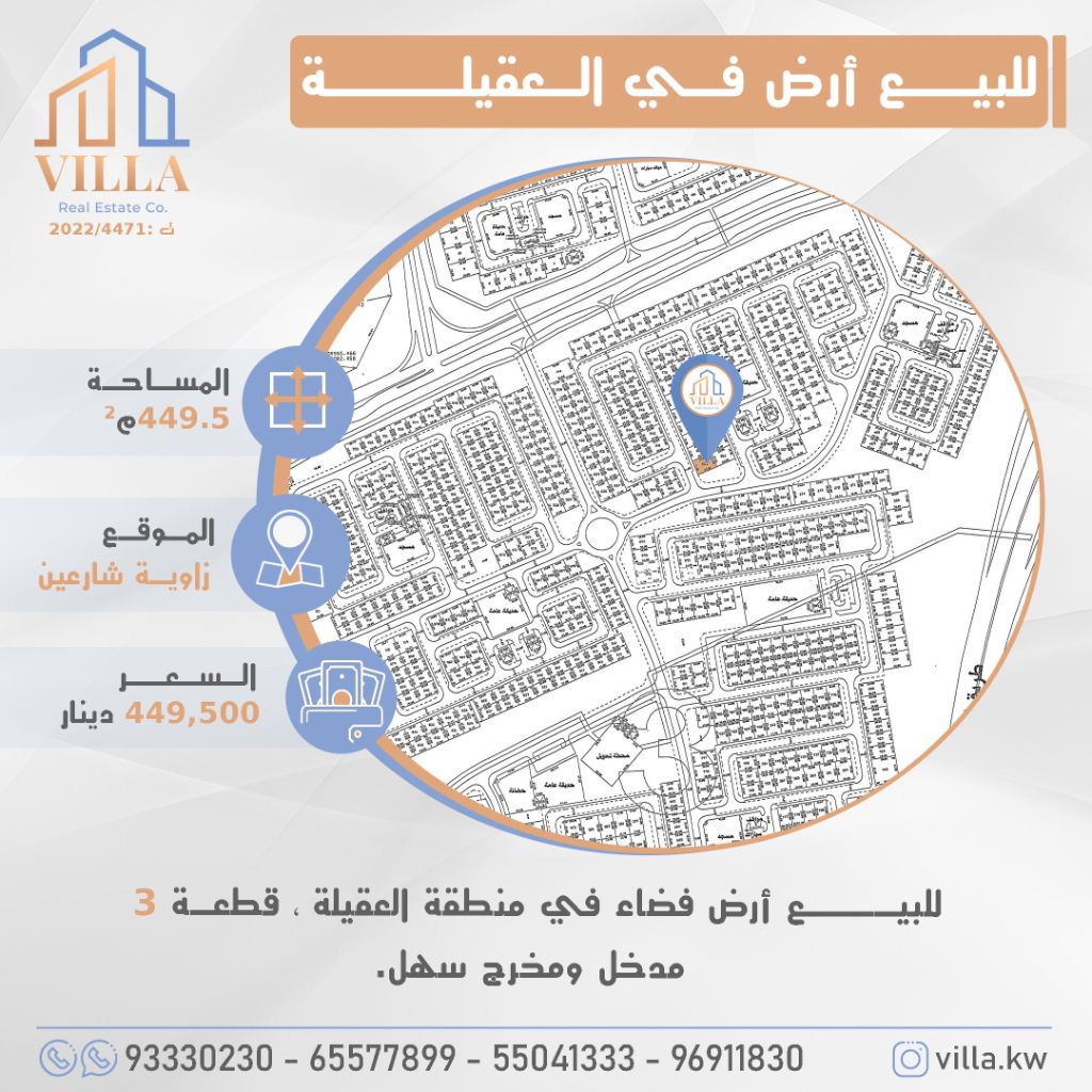 للبيع أرض فضاء في منطقة العقيلة، قطعة 3، المساحة 449.5 متر مربع، الموقع زاوية شارعين، مدخل ومخرج سهل. السعر 449,500 دينار كويتي. للاستفسار: نقال 1، نقال 2، نقال 3، نقال 4.