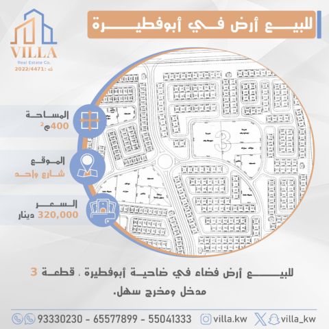 For sale: vacant land in Abu Fatira suburb, plot 3, area 400 sqm, location on a single street, easy access and exit. Price 320,000 Kuwaiti dinars. For inquiries, mobile 1, mobile 2, mobile 3.