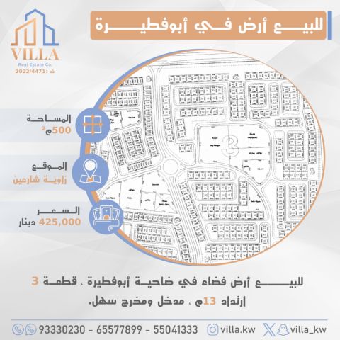 For sale: a vacant land in Abu Fatira suburb, plot 3, area 500 sqm, located at the corner of two streets, setback 13m, easy access and exit. Price 425,000 Kuwaiti dinars. For inquiries, mobile 1, mobile 2, mobile 3.