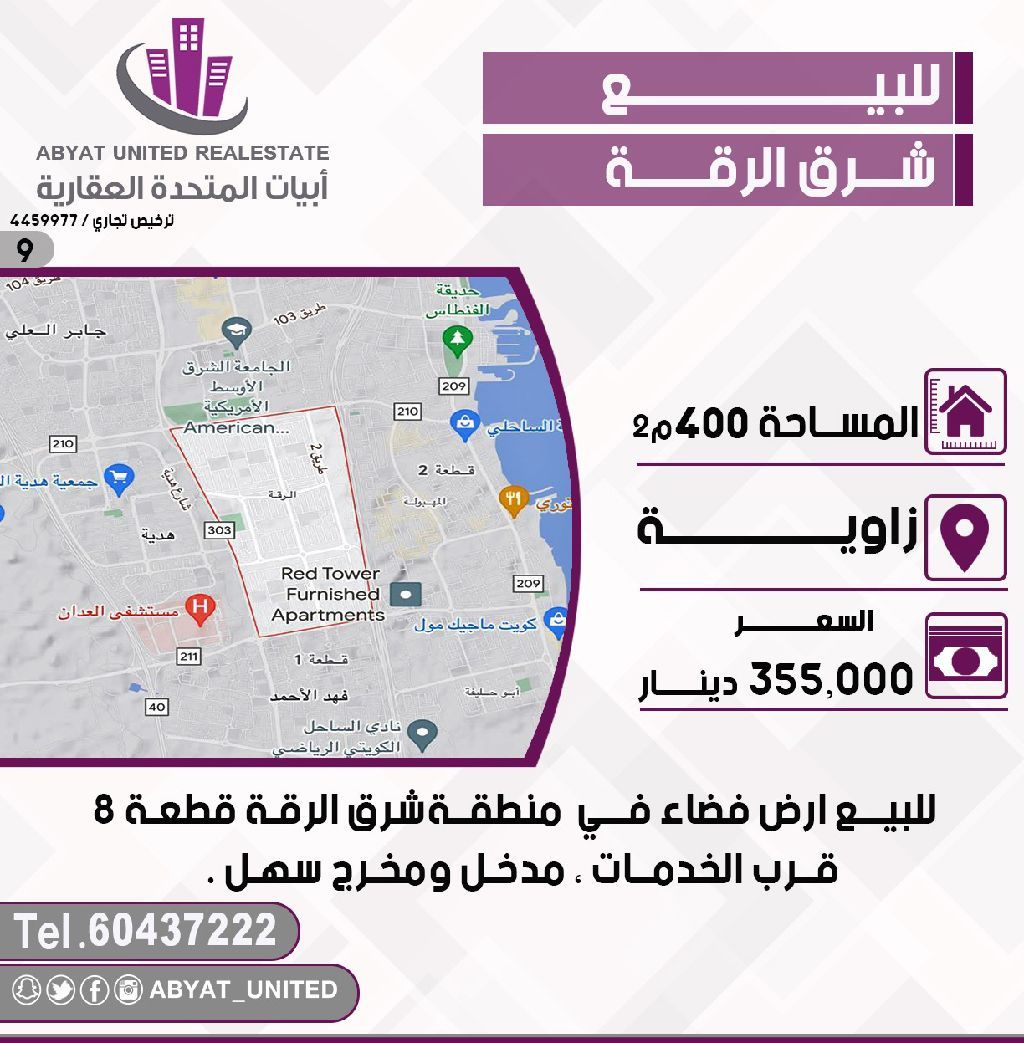 For sale: An empty land in the East Al-Raqqa area, plot number 8. The location is on a corner, with an area of 400 square meters, near services, and easy access. For inquiries, call mobile number 1. Price: 355,000 dinars. Code: 9.