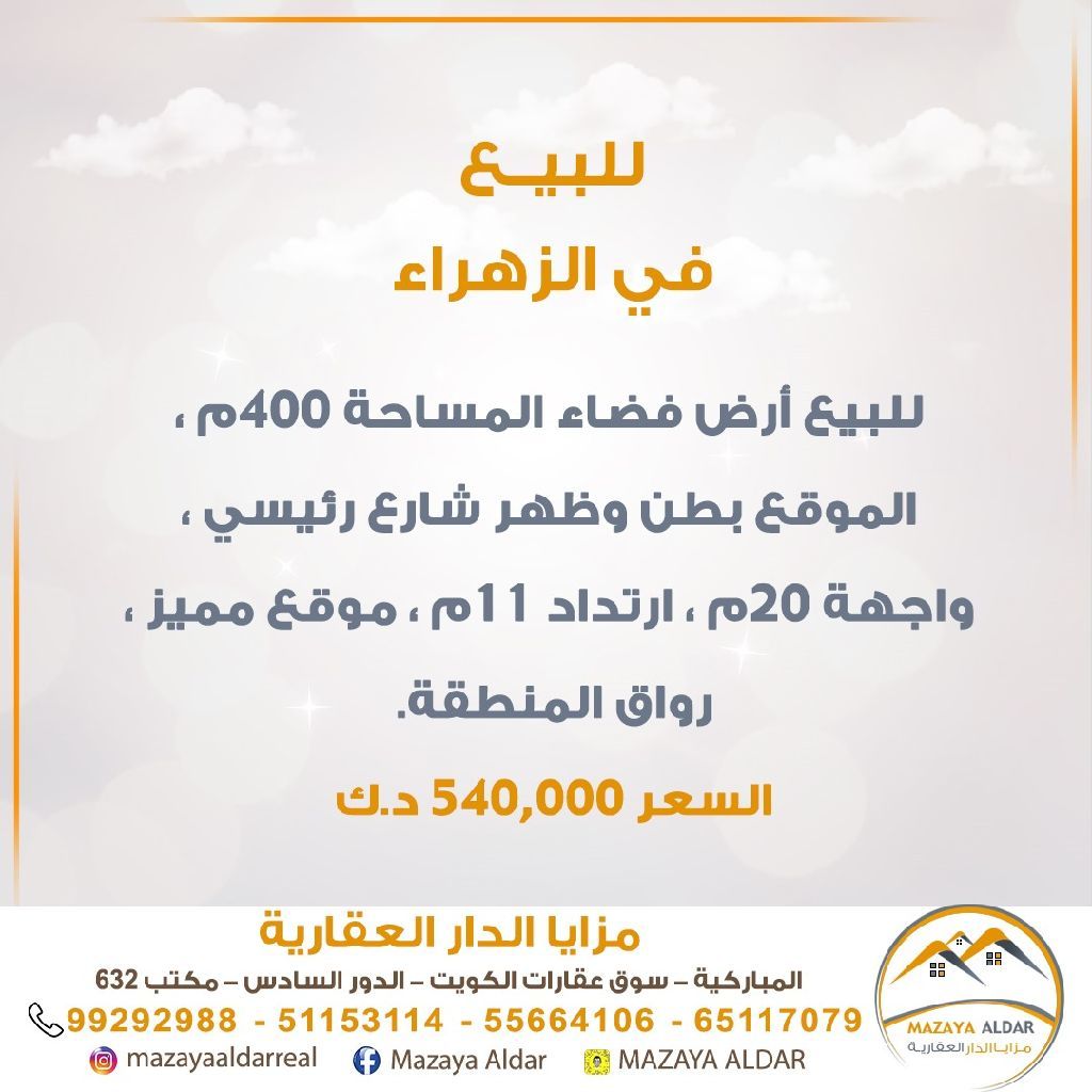 For sale: A vacant land in Al Zahra Suburb with an area of 400 square meters. The location is on a main street with front and back access, a frontage of 20 meters, and a setback of 11 meters. It is a prime location in the neighborhood's corridor. For serious buyers only, no brokers allowed. Price: 540,000 dinars. For inquiries, contact via mobile.