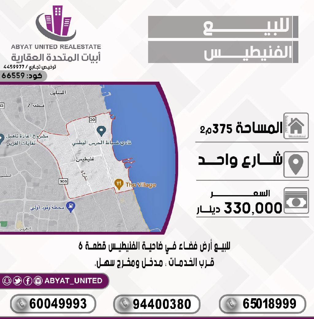 For sale: A vacant land in Fintas suburb, plot 6. Location: One street, area 375 m², near services, easy access. For inquiries, mobile 1, mobile 2, mobile 3. Price: 330,000 dinars. Code: 66559.