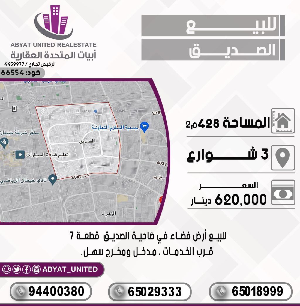 For sale: A vacant land in Al-Sadeeq suburb, plot 7. Location: 3 streets, area 428 m², near services, easy access. For inquiries, call Mobile 1, Mobile 2, Mobile 3. Price: 620,000 dinars. Code: 66554.