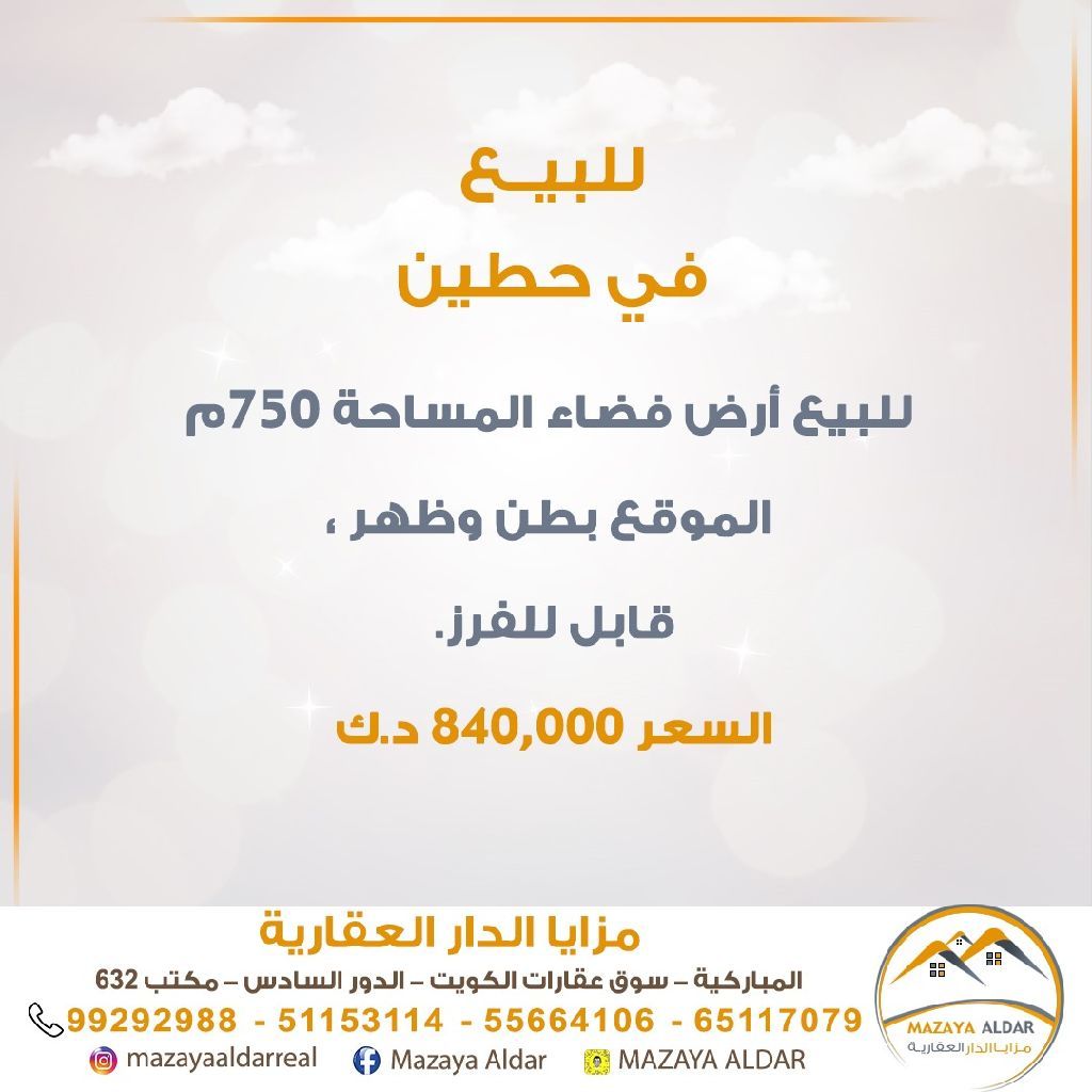 For sale, a vacant land in Hitteen Suburb, area 750 sqm. The location is flat and has a backside, suitable for subdivision. For serious buyers only, brokers are prohibited. Price: 840,000 dinars. For inquiries, call the mobile number.