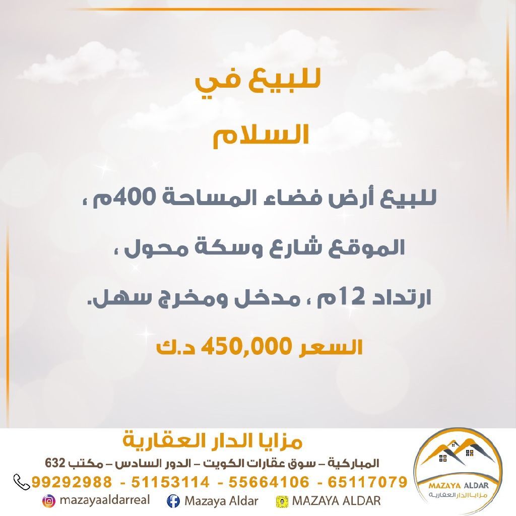 For sale: a vacant land in Al-Salam suburb, area 400 sqm, located on a street and a transformer alley, with a 12m setback, easy access and exit. Price 450,000 dinars for serious buyers only, brokers are prohibited. For inquiries, call the mobile number.