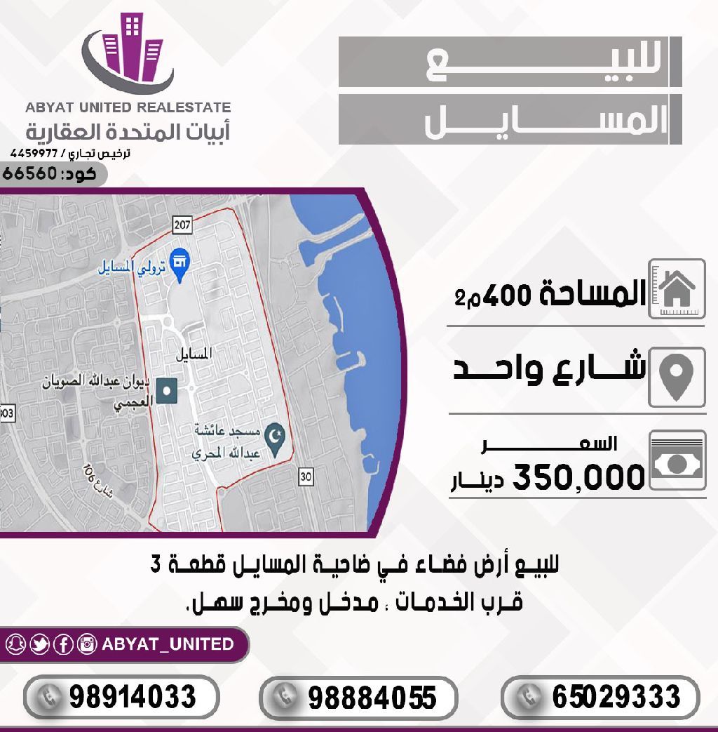 For sale: Vacant land in Al-Masayel suburb, Block 3. Location: Single street, Area: 400 sqm, Near services, Easy access. For inquiries, Mobile 1, Mobile 2, Mobile 3. Price: 350,000 dinars. Code: 66560.