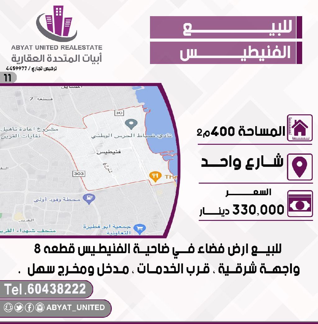 For sale: Vacant land in Fintas suburb, Block 8. Location: Street 1. Area: 400 sqm. Eastern frontage. Near services. Easy access. For inquiries, call mobile 1. Price: 330,000 Kuwaiti dinars. Code: 11.