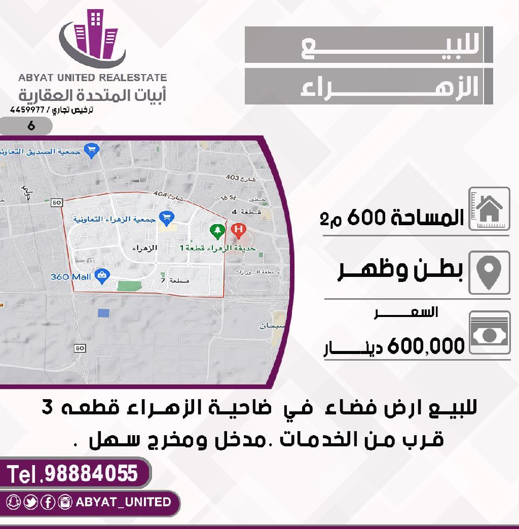For sale: A vacant land in Al Zahraa Suburb, Plot 3. The location is flat and accessible from both sides. The area is 600 square meters, near services, with easy entry and exit. For inquiries, call Mobile 1. The price is 600,000 dinars. Code: 6.