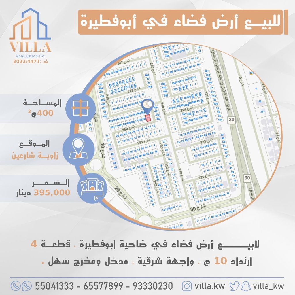 For sale: vacant land in Abu Fatira suburb, plot 4, area 400 sqm, corner location with two street fronts, eastern facade, easy access and exit. Price 395,000 KD. For inquiries, mobile 1, mobile 2, mobile 3.