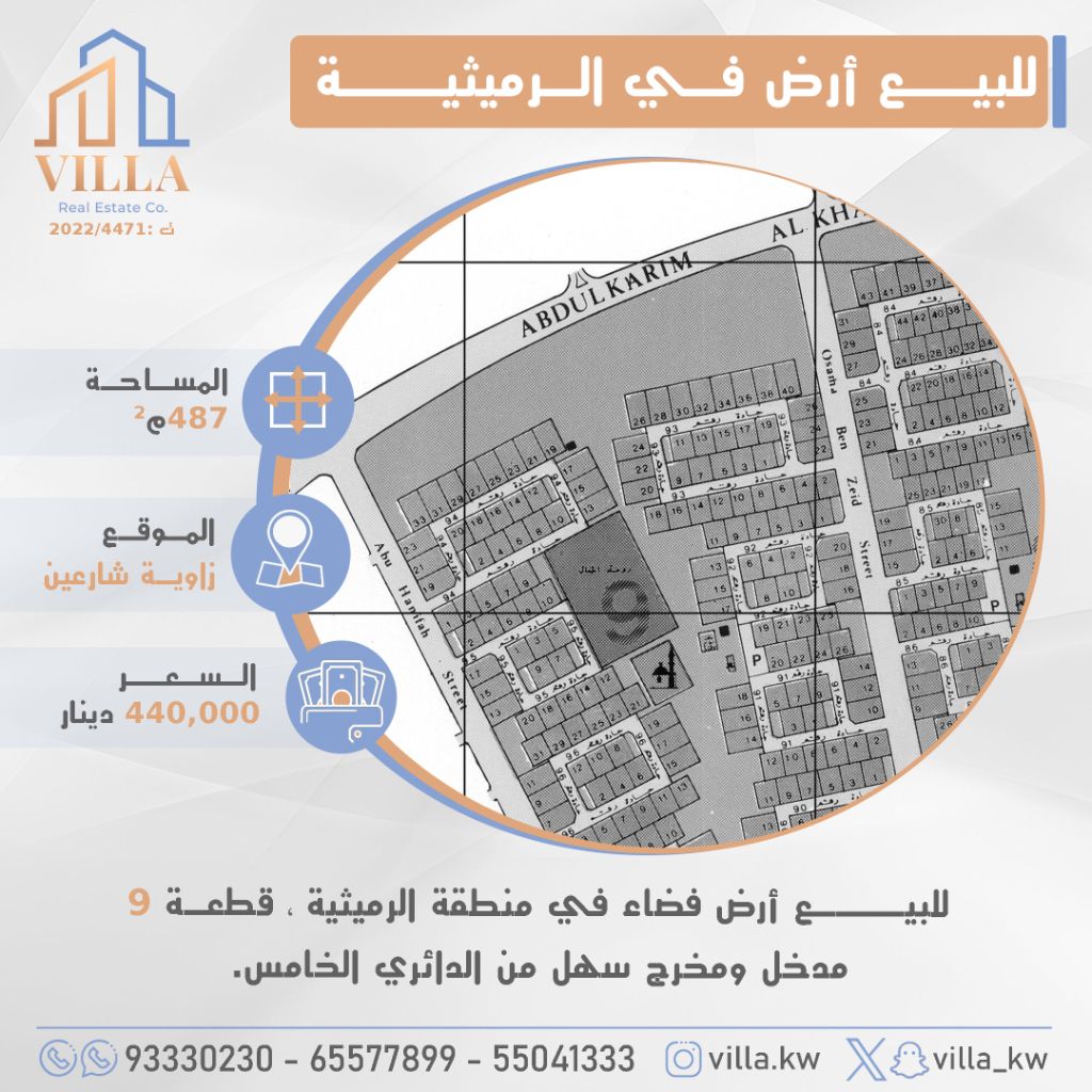 For sale, an empty land in the Al-Rumaithiya area, plot 9, area 487 square meters, located at the corner of two streets, with easy access from the Fifth Ring Road. Price 440,000 Kuwaiti Dinars. For inquiries, call mobile 1, mobile 2, mobile 3.