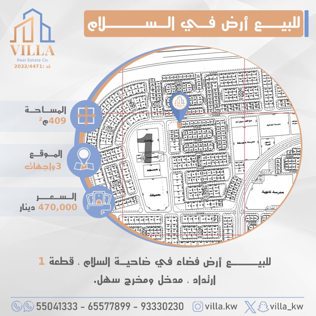 For sale: Vacant land in the Al-Salam area, Plot 1, Area 409 sqm, Location with 3 frontages, Setback, Easy access and exit. Price 470,000 KD. For inquiries, call Mobile 1, Mobile 2, Mobile 3.