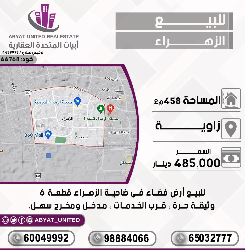 For sale, a vacant land in Al Zahraa Suburb, Plot 6. The location is on a corner, with an area of 458 square meters. It has a freehold document, is near services, and has easy access. For inquiries, contact Mobile 1, Mobile 2, Mobile 3. Price: 485,000 dinars. Code: 66768.
