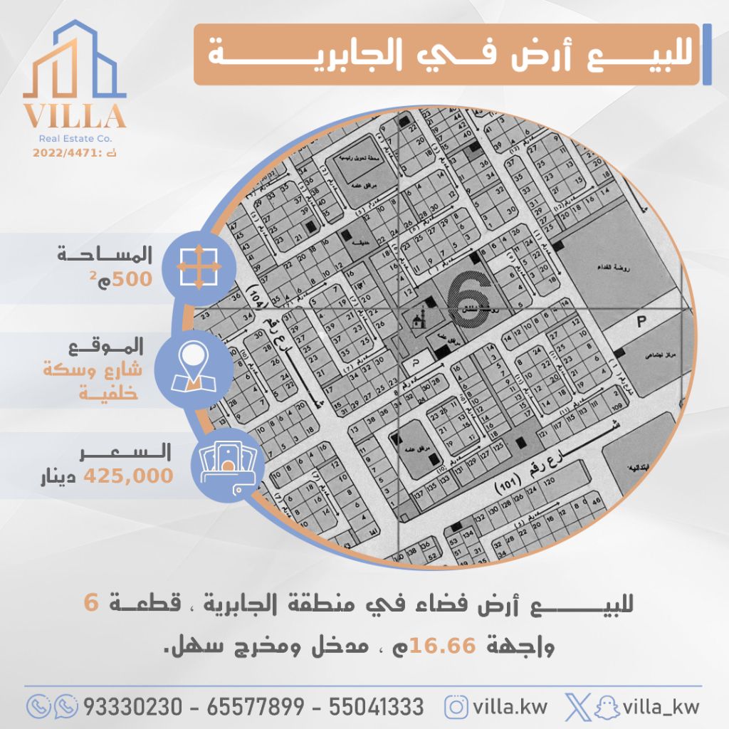For sale: a vacant land in Al-Jabriya area, plot 6, area 500 sqm, location on a street with a back alley, frontage 16.66m, easy access and exit. Price 425,000 Kuwaiti Dinars. For inquiries, mobile 1, mobile 2, mobile 3.