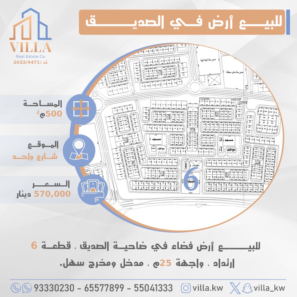 For sale, an empty plot of land in Al-Sadeeq suburb, plot number 6, area 500 square meters, location on a single street, setback, frontage 25 meters, easy access and exit. Price 570,000 Kuwaiti dinars. For inquiries, mobile 1, mobile 2, mobile 3.