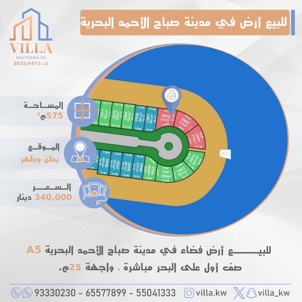 For sale, a vacant land in Sabah Al-Ahmad Marine City - A5, area 575 sqm, location front and back, first row directly on the sea, frontage 25m. Price 340,000 Kuwaiti Dinars. For inquiries, mobile 1, mobile 2, mobile 3.