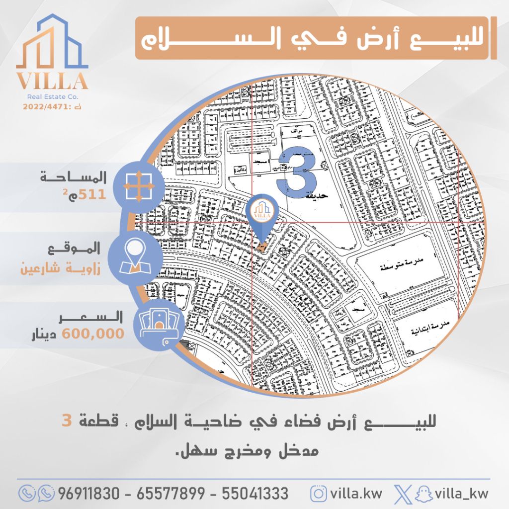 For sale: vacant land in Al-Salam suburb, plot 3, area 511 sqm, corner location with two street fronts, easy access. Price 600,000 Kuwaiti dinars. For inquiries, mobile 1, mobile 2, mobile 3.