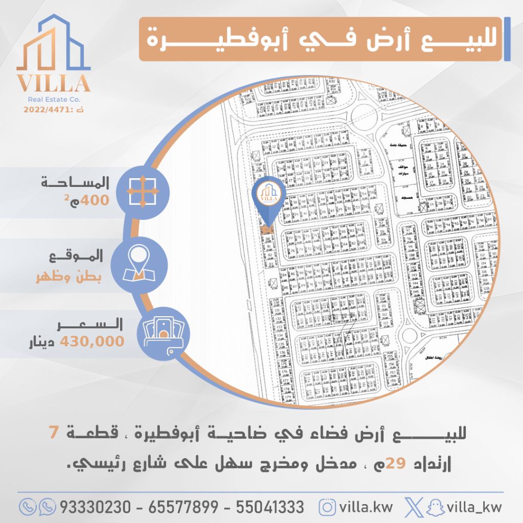 For sale: vacant land in Abu Fatira suburb, plot 7, area 400 sqm, location with front and back access, setback 29m, easy entrance and exit onto a main road. Price 430,000 KD. For inquiries, mobile 1, mobile 2, mobile 3.
