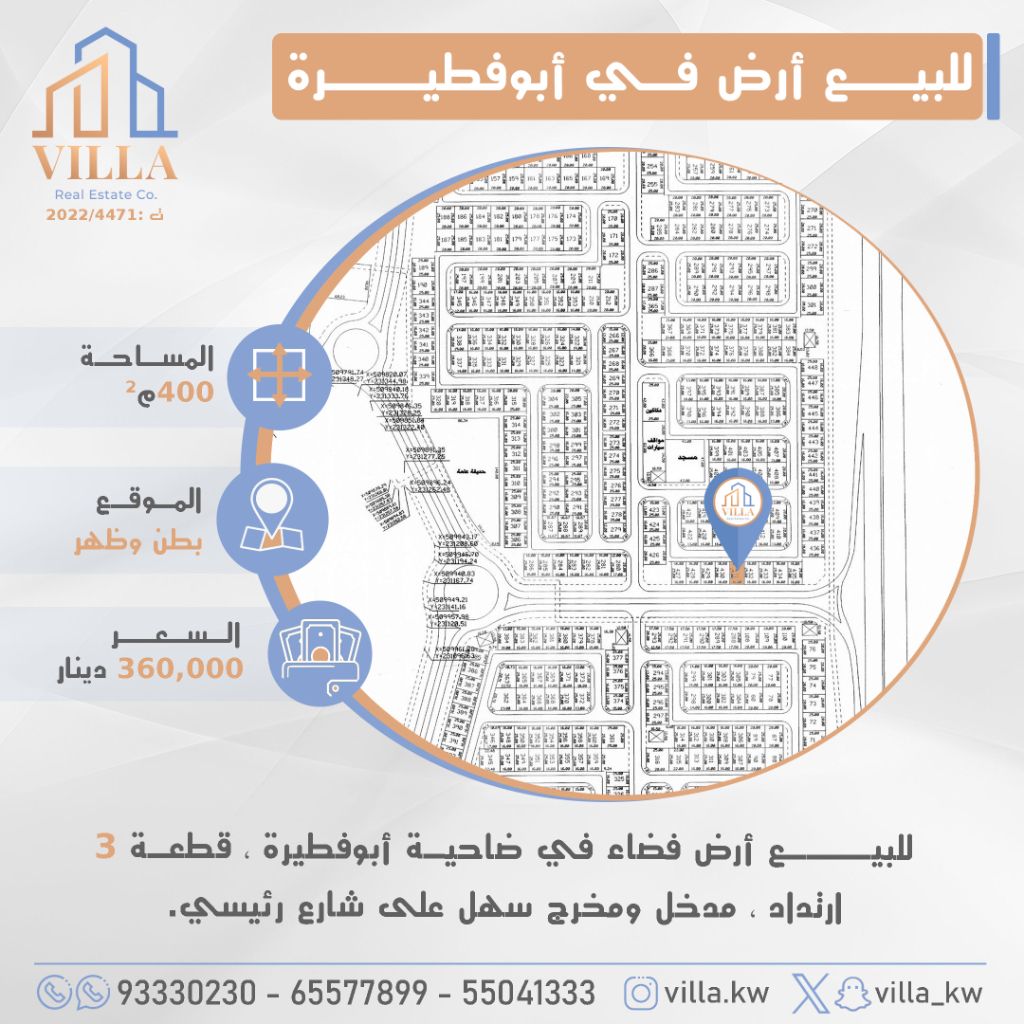 For sale, a vacant land in Abu Fatira suburb, plot 3, area 400 sqm, location with front and back access, setback, easy entrance and exit on a main street. Price 360,000 Kuwaiti dinars. For inquiries, mobile 1, mobile 2, mobile 3.