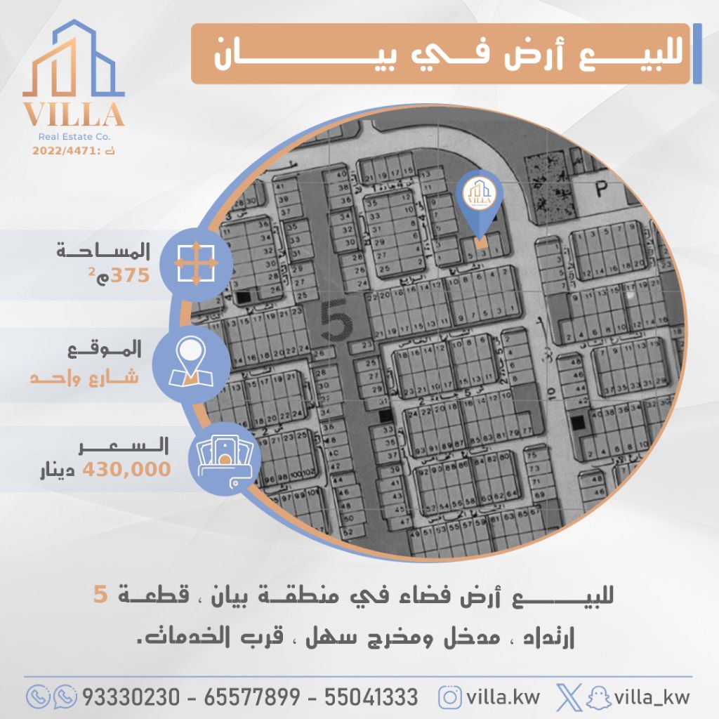 For sale, a vacant land in the Bayan area, plot 5, area 375 sqm, location on a single street, setback, easy access and exit, all services available. Price 430,000 Kuwaiti Dinars. For inquiries, mobile 1, mobile 2, mobile 3.