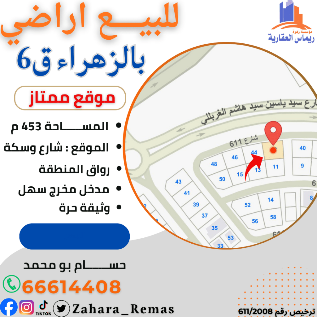 For sale, lands in Al-Zahra with various locations. Area: 453 square meters. Location: street and side alley, excellent entrance and exit. Freehold document. Price: 476 thousand.
