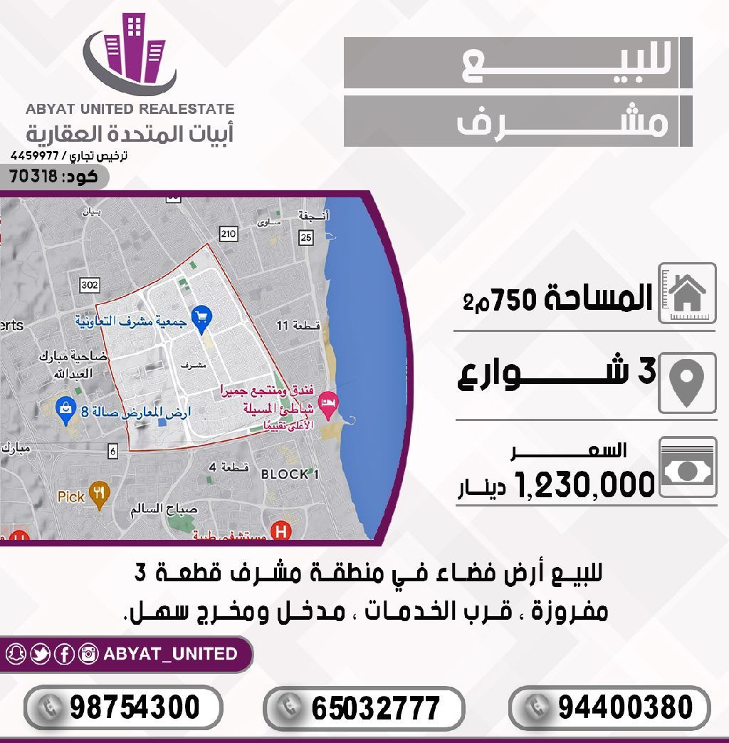 For sale: Vacant land in the Mishref area, Plot 3, Location 3, with three streets. Area: 750 square meters, subdivided, near services, easy access and exit. For inquiries, Mobile Number 1, Mobile Number 2, Mobile Number 3. Price: 1,230,000 dinars. Code: 70318.