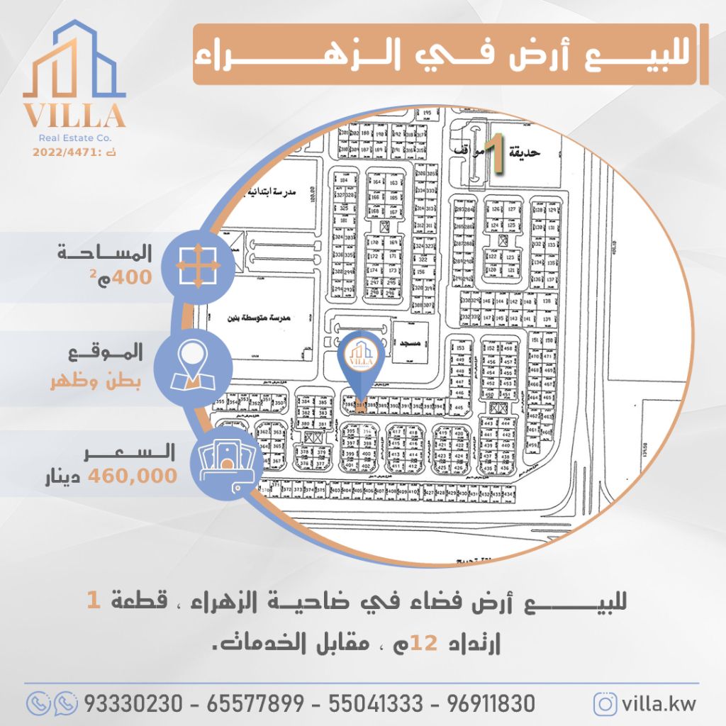 For sale, a vacant land in Al Zahraa suburb, plot 1, area 400 sqm, location with front and back access, setback 12m, opposite services. Price 460,000 Kuwaiti dinars. For inquiries, mobile 1, mobile 2, mobile 3, mobile 4.