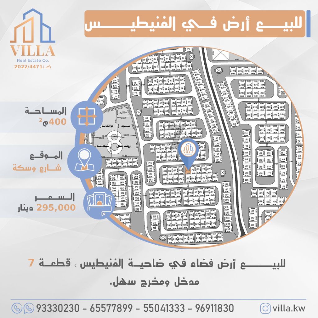 For sale: vacant land in Fintas suburb, plot 7, area 400 sqm, location on a street and alley, easy access and exit. Price 295,000 Kuwaiti dinars. For inquiries, mobile 1, mobile 2, mobile 3, mobile 4.