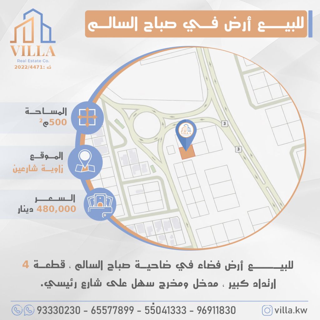 For sale: a vacant land in Sabah Al-Salem suburb, plot 4, area 500 sqm, located at the corner of two streets, with a large setback, easy access and exit to a main road. Price 480,000 Kuwaiti Dinars. For inquiries, mobile 1, mobile 2, mobile 3, mobile 4.