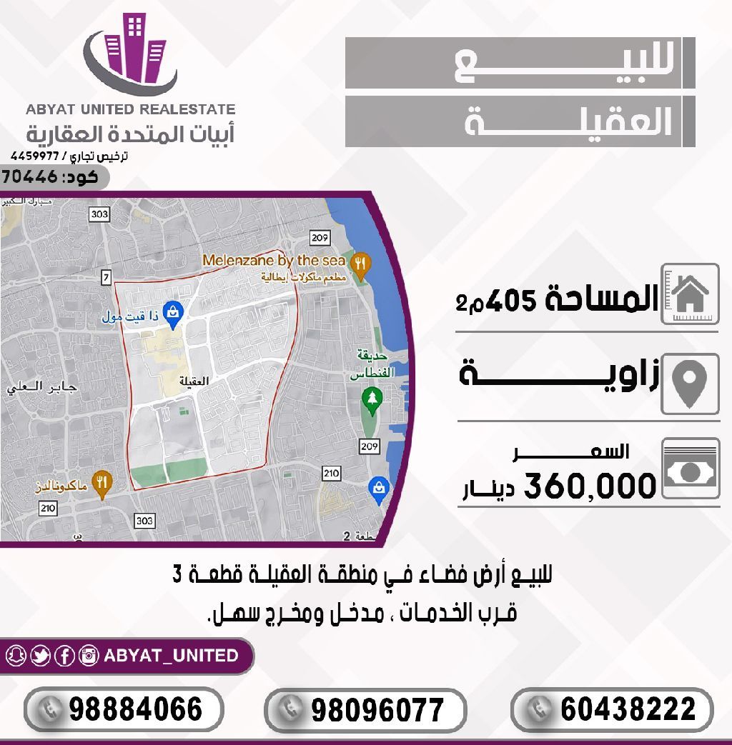 For sale: vacant land in the Aqila area, plot number 3, corner location, area 405 square meters, near services, easy access and exit. For inquiries, mobile number 1, mobile number 2, mobile number 3 - Price: 360 thousand dinars - Code: 70444